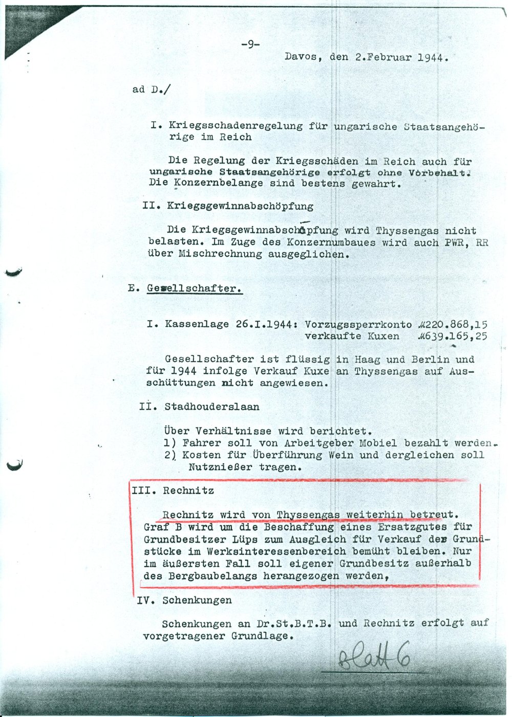 The profitability of the Thyssens’ war-time production, and ship building in particular, is mentioned but Thomas Urban says that verifiable figures are „not available“. But some of these figures are contained for instance in the minutes of the board meetings held quarterly in Flims, Davos, Lugano and Zurich (not just „Switzerland“ – in other words Heinrich was not too ill to travel around, he just did not want to leave Switzerland once war had started; simply for reasons of comfort rather than being “anti-Nazi”) with four participants (Baron Heinrich, Wilhelm Roelen, Heini Thyssen and Heinrich Lübke, Director of the August Thyssen Bank in Berlin – the two latter being played down by Urban). And the minutes were not taken by some anonymous „private secretary“ but in all probability by Wilhelm Roelen, which explains why copies are both in the corporate and private archives. We feel sure that the ThyssenKrupp Archives, respectively those of the Thyssen Industrial History Foundation, contain further relevant information about profitability – for instance in the files of the estate of Dr Wilhelm Roelen – but which for some reason are not being released.