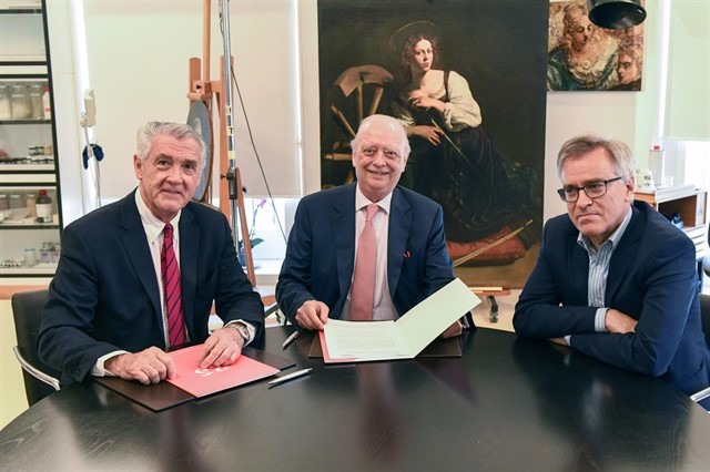 A representative of the ASISA charity funding the restoration (middle), with two representatives of the Thyssen Museum Madrid (photo copyright: Guillermo Navarro, ABC newspaper, Spain)